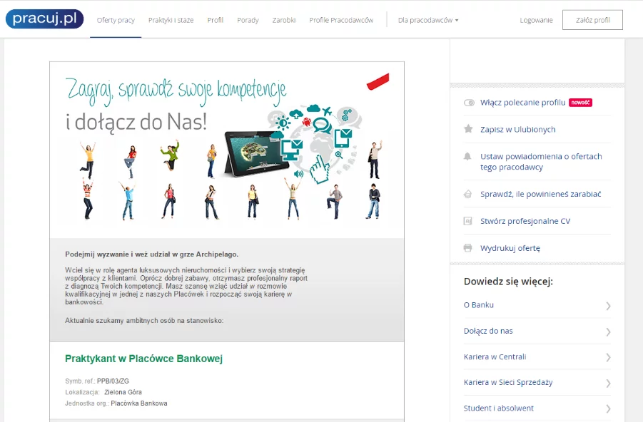 Joanna Kochmańska, HR Business Partner Credit Agricole Bank Polska, zapytana o Competence Game, mówi: „Gra składa się z 10 rund i trwa ok. 2,5 h. W jednej z pierwszych tego typu gier online na rynku masz okazję wcielić się w agenta luksusowych nieruchomości i wykonując kolejne zadania wybrać swoją strategię współpracy z klientami. Przejrzyste zasady i łatwa nawigacja sprawiają, że to nie tylko gra dla maniaków komputerowych. Dodatkowo dostępny jest nieograniczony czasowo moduł treningowy przed główną rozgrywką, co powoduje, że rozgrywka może być atrakcyjna nawet dla osób mniej obeznanych z tego typu aplikacjami. Gra mierzy 3 główne kompetencje ważne m.in. w Credit Agricole: orientację na klienta, definiowanie i osiąganie celów oraz myślenie systemowe. Archipelago wykorzystano m.in. w ramach procesu rekrutacji do programu praktyk w Regionalnej Sieci Sprzedaży w całej Polsce. – W ciągu kilku miesięcy ponad 100 osób zagrało w grę. Finalnie z tej grupy zapraszaliśmy osoby do odbycia praktyki w naszych placówkach i zdobycia pierwszych doświadczeń zawodowych w bankowości. Ponadto dodaje „Firmy, które zdecydowały się na wykorzystanie gry online, już na starcie potwierdzają swoją innowacyjność, a kandydatom zamiast stresu w procesie rekrutacyjnym gwarantują elementy intelektualnej rozrywki.” Sprawdź czy gry w rekrutacji są dla Ciebie.