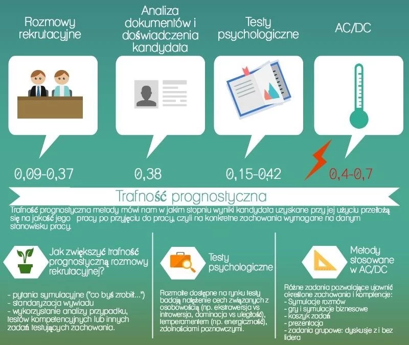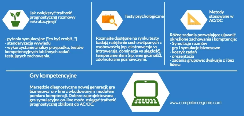 „Assessment Centre, czyli AC, jest jedną z najskuteczniejszych metod wspierających proces rekrutacji, która niweluje ryzyko zatrudnienia niewłaściwej osoby i ewentualne koszty z tym związane. AC wykorzystuje się zarówno jako wsparcie rekrutacji zewnętrznych, jak i wyłaniania najlepszych kandydatów z wewnątrz organizacji. Większość narzędzi stosowana w rekrutacjach odwołuje się do samooceny kandydata, podczas gdy AC odwołuje się do jego zachowania w rzeczywistości przypominającej środowisko pracy.” Ten krótki fragment wystarczająco w tym kontekście pokazuje, jak bardzo AC wyróżnia się wśród innych narzędzi.