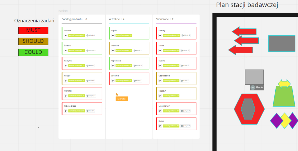 - Grupa spotyka się na platformie online, w podziale na mniejsze zespoły realizują zadanie na współdzielonej tablicy Miro, na której przygotowane są wytyczne i narzędzia niezbędne do wykonania zadania.