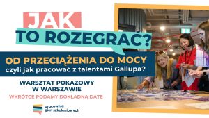 dokładna data wkrótce – WARSZAWA – SPOTKANIE STACJONARNE Warsztat pokazowy: Od przeciążenia do mocy – czyli jak pracować z talentami Gallupa Pracownia Gier Szkoleniowych gra: Ekspedycja mocy trenerka: Agnieszka Szymańska