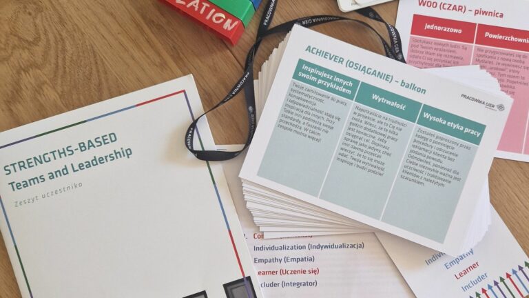 Jagoda Gandziarowska-Ziołecka: Pierwszym krokiem jest zrobienie testu StrengthsFinder. Potem wartością jest feedback – co ten wynik testu mówi o mnie, mojej możliwej roli w zespole i organizacji. Taki feedback albo od coacha albo od przełożonego, albo – dla odważniejszych – od otoczenia, rodziny, kolegów i koleżanek z pracy. Dla organizacji, które chciałyby oprzeć swoją kulturę organizacyjną na podejściu „StrengthsFinder” jest mnóstwo możliwości. Za każdym razem jest to inna paleta – w zależności od potrzeb i sytuacji wyjściowej firmy. Można też podziałać na mniejszym polu – polu zespołu. Zrobić test wszystkim członkom, a potem team-buildinigowe warsztaty oparte na grach i symulacjach pomagające zrozumieć, jak talenty tego zespołu objawiają się w działaniu, co cenimy w sobie nawzajem i w czym jesteśmy dobrzy, z czego mogą wynikać różne nasze słabsze obszary. Praca nad siłami zespołu to też większe zrozumienie swoich słabszych stron, a większe zrozumienie pomaga nie oceniać, nie przekreślać, tylko próbować znaleźć rozwiązanie. Takie wzmocnienie działa na każdy zespół ogromnie motywująco, zwłaszcza, że na co dzień pewnie nie wystarczająco się nawzajem doceniamy. System edukacji wyjątkowo silnie zakorzenia nawyk skupienia się na tym, co wychodzi gorzej – nam i innym. Przez to jesteśmy surowi i krytyczni. Uczestnicy takich warsztatów często odkrywają, że docenienie i umiejętne zaprzęgnięcie talentów do działania jest zapomnianą sztuką, której trzeba się od nowa nauczyć.