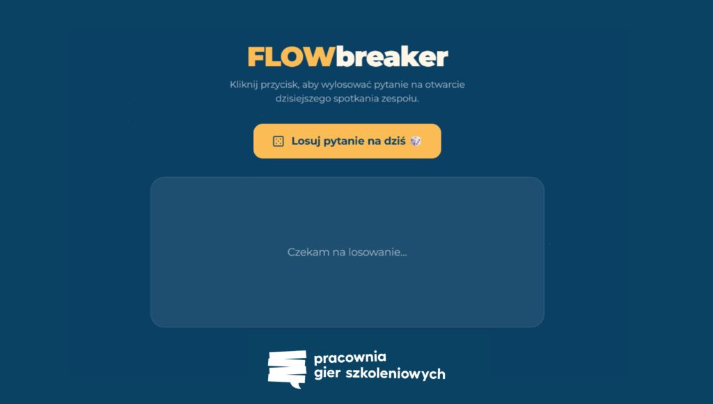Odbierz darmowy dostęp do FLOWbreakera – cyfrowego generatora pytań otwierających (icebreakerów), stworzonego dla liderów, managerów i każdego, kto chce prowadzić lepsze spotkania. Podaj swój e-mail, a wyślemy Ci bezpośredni link do aplikacji, byś miał(a) ją zawsze pod ręką!