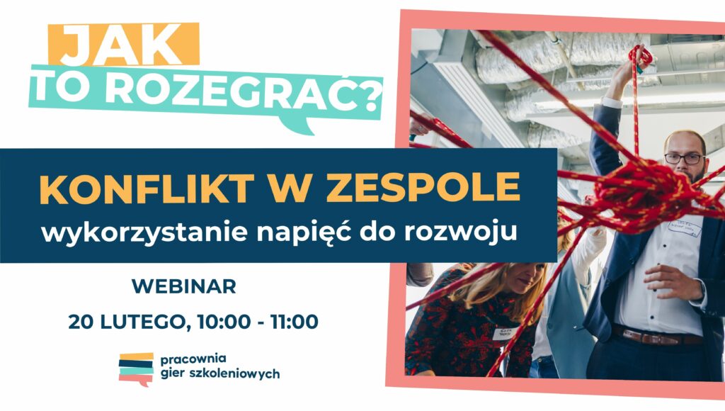 Czy wiesz, że konflikt w zespole nie musi być końcem współpracy, ale może stać się nowym otwarciem i wzmocnieniem jego fundamentów? Zapraszamy na webinar „Jak to rozegrać? Konflikt w zespole – wykorzystanie napięć do rozwoju zespołu”, podczas którego porozmawiamy o tym, jak gry i symulacje mogą pomóc skonfliktowanym zespołom znaleźć wspólną płaszczyznę i wzajemne zrozumienie.